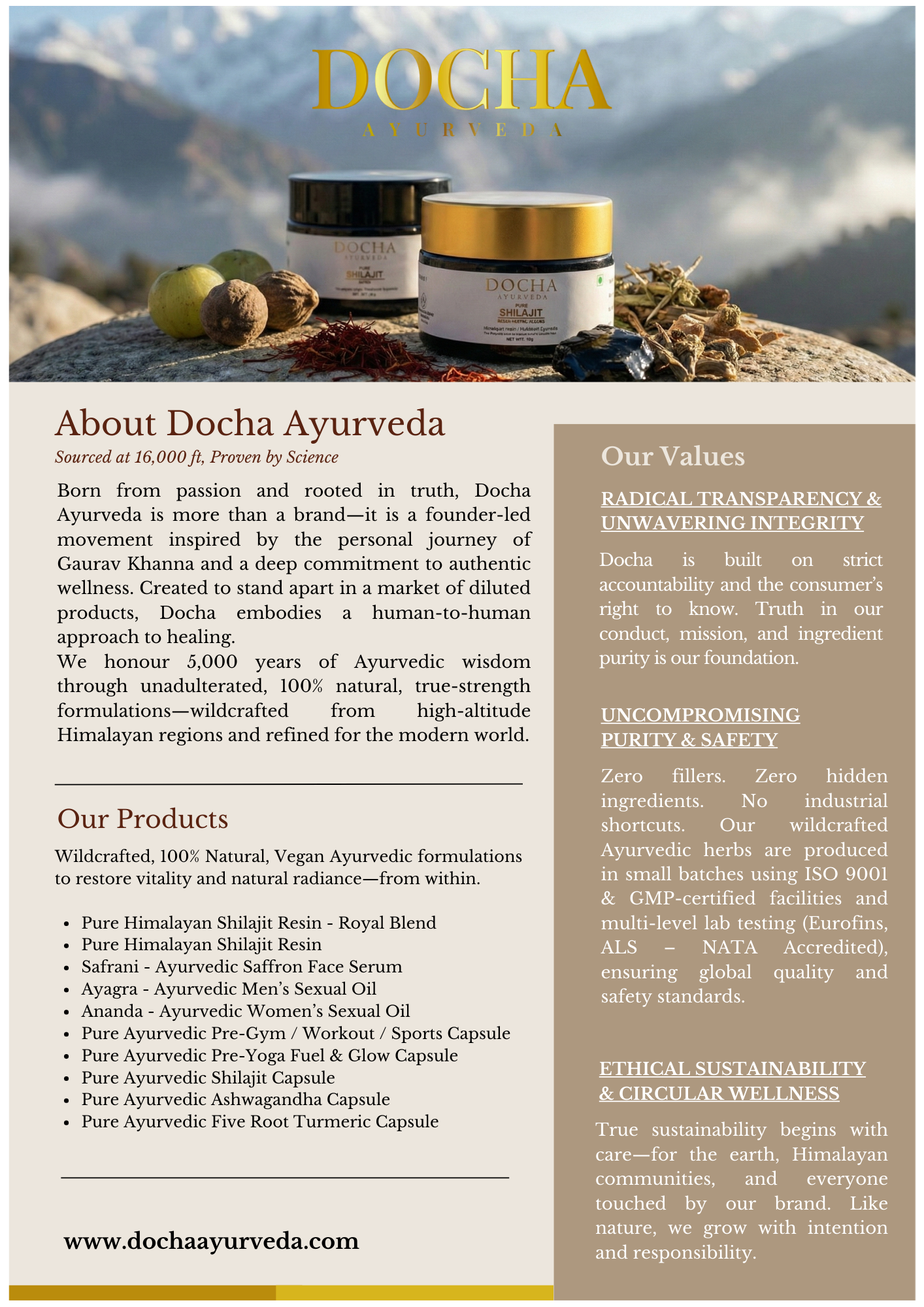 Born from ancient wisdom and shaped by a modern devotion to authenticity, Docha is an offering of purity, purpose, and deep reverence. Each creation is guided by Vedic principles and crafted slowly, in small batches, using wild-crafted botanicals and time-honored methods—where nothing is rushed, and everything is intentional.Our products are vegan, true natural, and uncompromising in quality-blending the soul of traditional Ayurvedic rituals with the precision of modern standards. But more than what we make, it’s how and why we make it that defines us. Docha is not built to be a corporation. It is a living expression of love—for nature, for truth, and for the extraordinary healing power of Ayurveda. We believe in beauty with depth, in rituals that restore, and in creating with care—for people, for the planet, and for the generations to come.