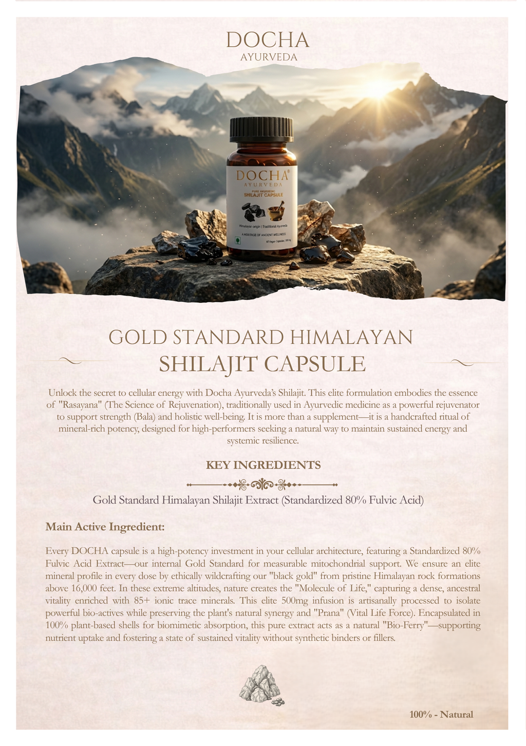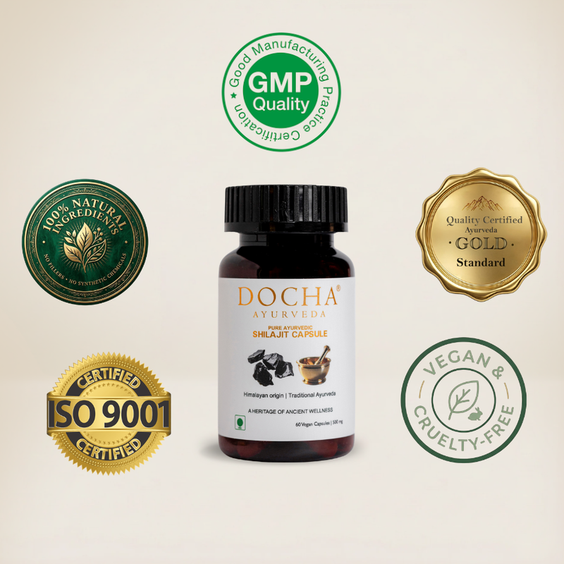 Quality and Purity Verified At Docha Ayurveda, we implement a rigorous, multi-tiered verification protocol designed to meet elite international standards. Our quality journey begins in specialized laboratories with meticulous in-house screening of our wildcrafted Himalayan Shilajit, ethically sourced from altitudes above 16,000ft. To guarantee the "Himalayan Gold Standard," we implement exhaustive testing at various stages of production, meticulously monitoring the concentration of Fulvic Acid and 85+ ionic minerals to ensure every batch achieves our ultra-potency benchmark for cellular energy.